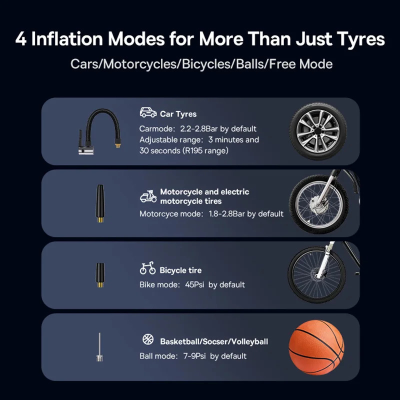 - Multiple Inflation Modes: Cars/motorcycles/bicycles/balloons/free settings, five modes, satisfying various needs