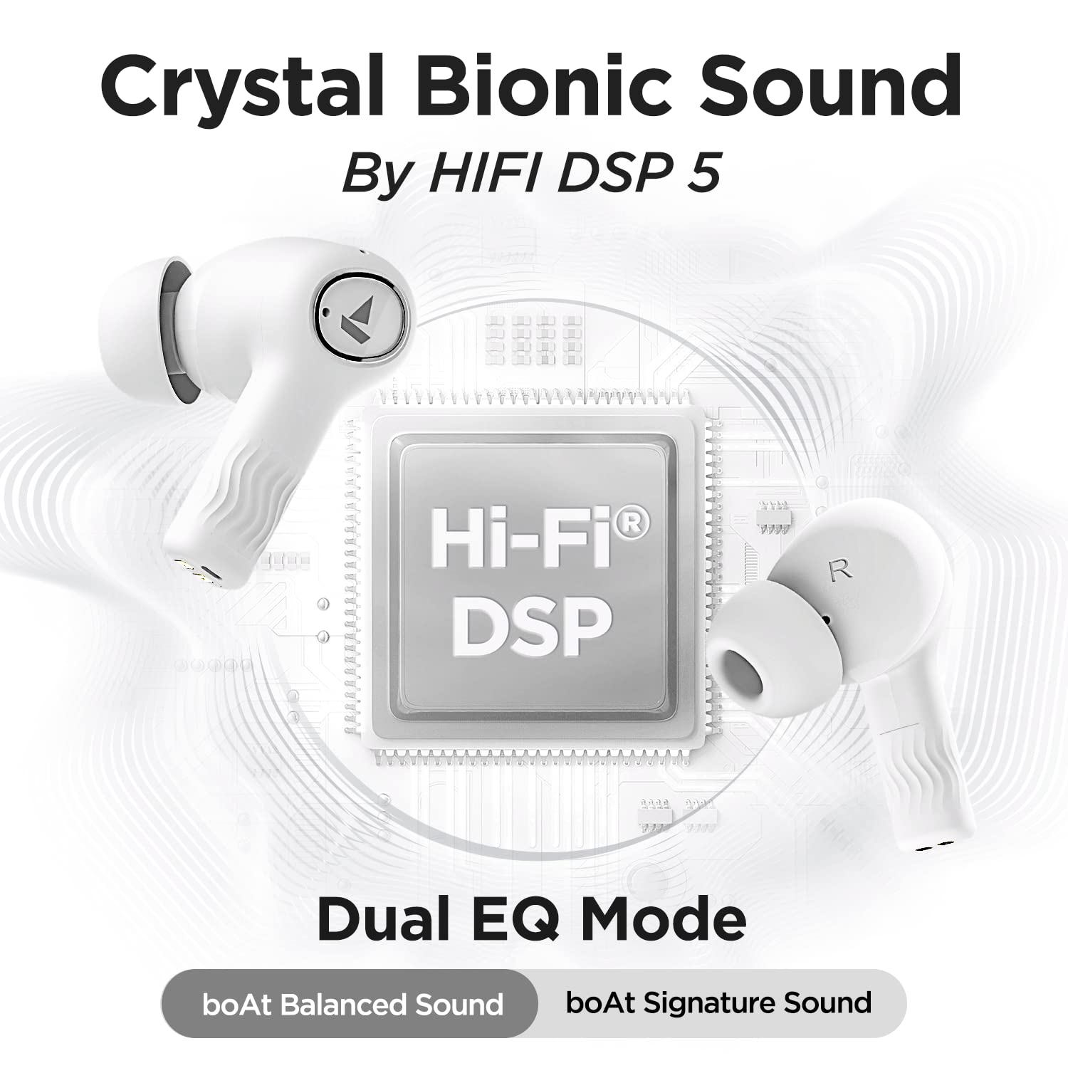 - Crystal Bionic Sound with Dual Modes- These true wireless earbuds have Crystal Bionic Sound powered by Hifi DSP 5 which support dual eq modes: boAt Signature Sound and boAt Balanced Sound