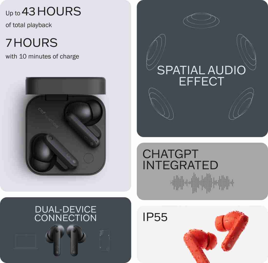 Talk time with ANC on / Transparency Mode: 18.6 hours with case and 4.8 hours with buds only