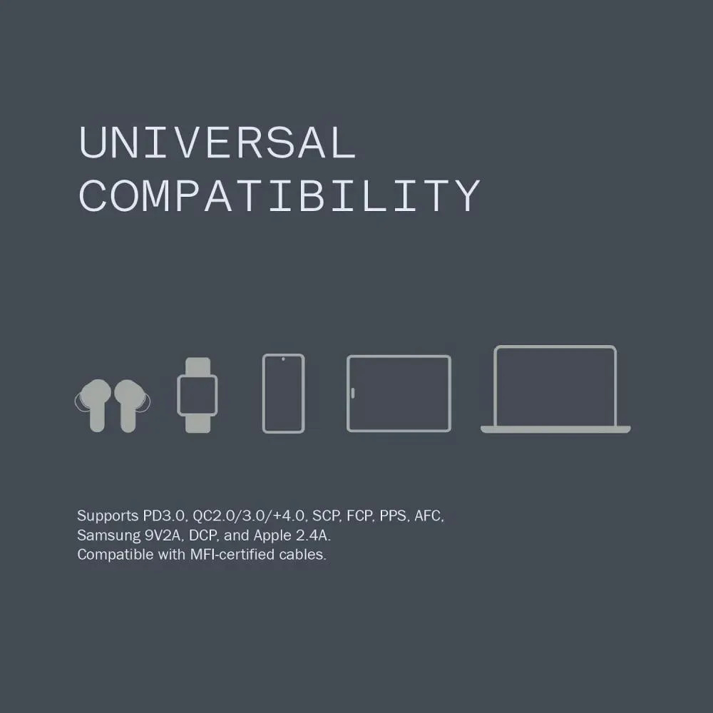 - Works with PD3.0, QC4.0+/3.0/2.0, FCP, PPS, Apple 2.4A, Samsung 9V2A, DCP devices.