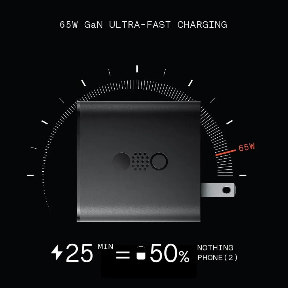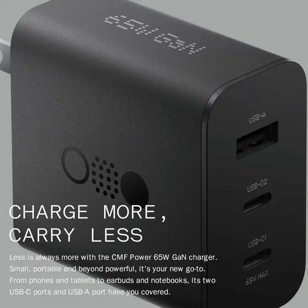 The CMF By Nothing 65W GaN Charger provides fast, efficient, and compact charging for all your devices, eliminating bulky adapters and tangled cables.