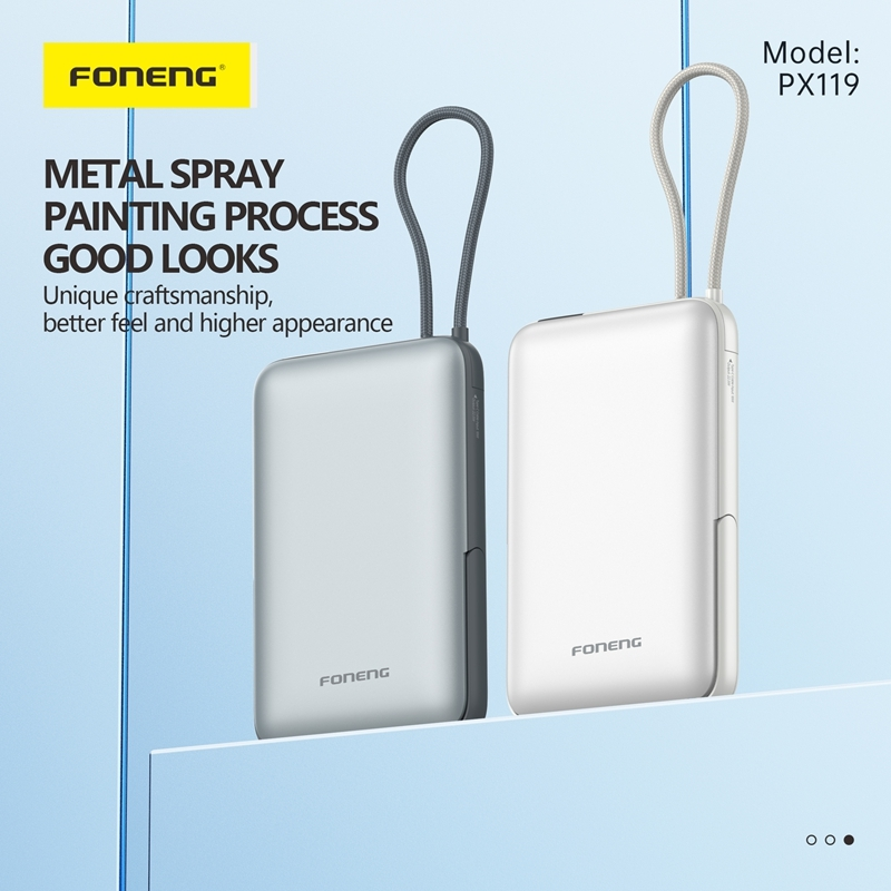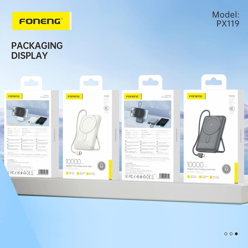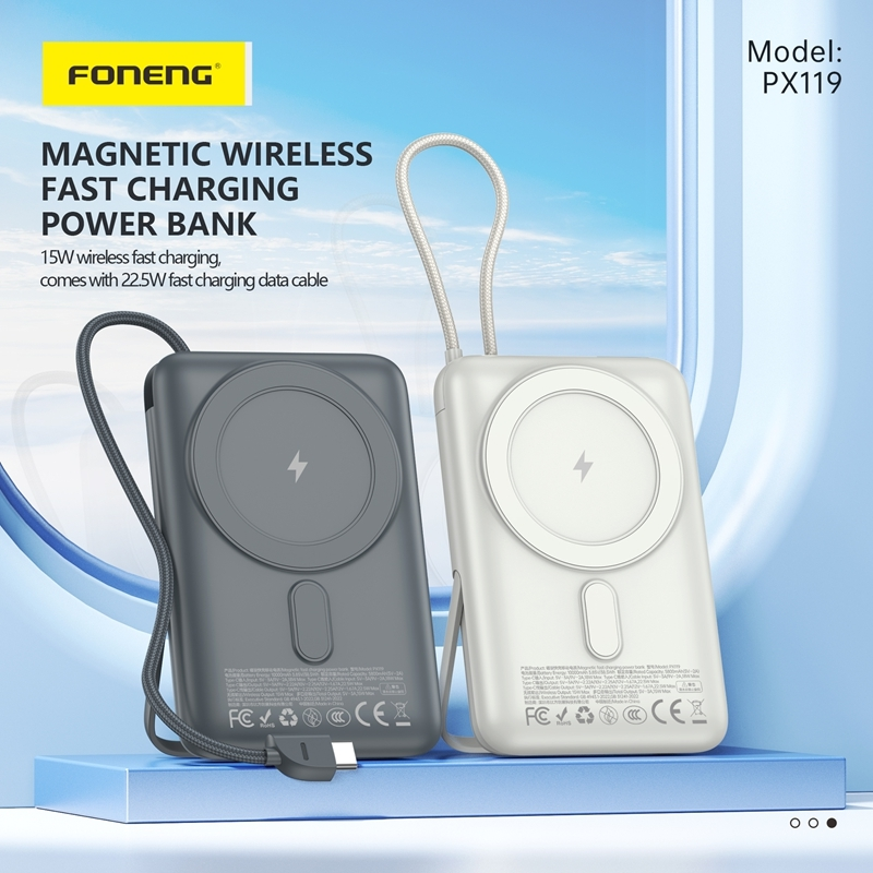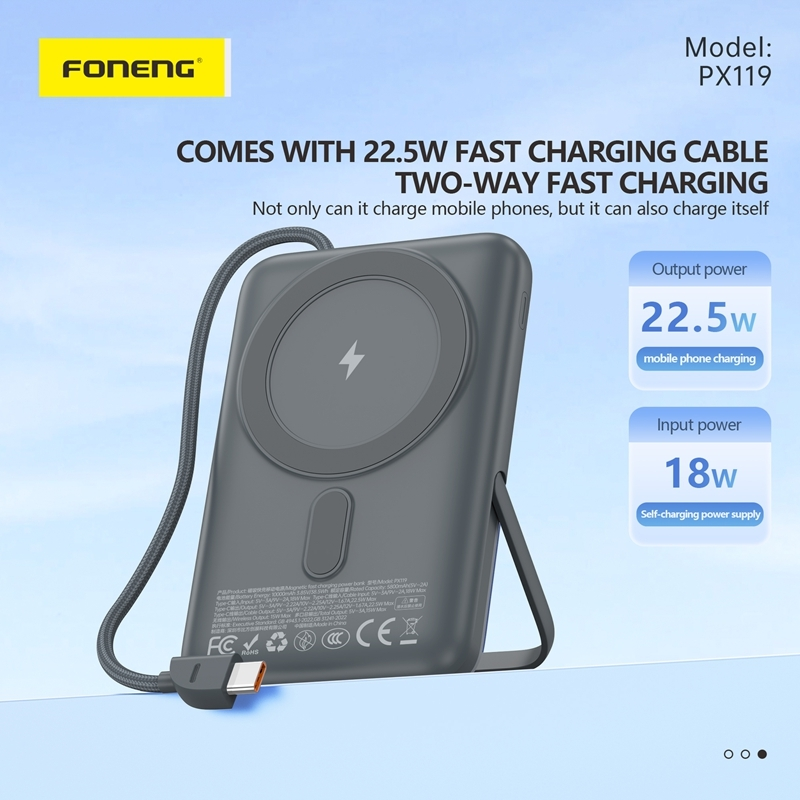 The FONENG PX119 10000mAh Magnetic Power Bank 22.5W is a powerful and convenient portable charger that comes with a built-in cable and stand. With a 22.5W output, it can quickly charge your devices on-the-go. The magnetic design ensures a secure and efficient charging experience, making it the perfect choice for busy lifestyles.