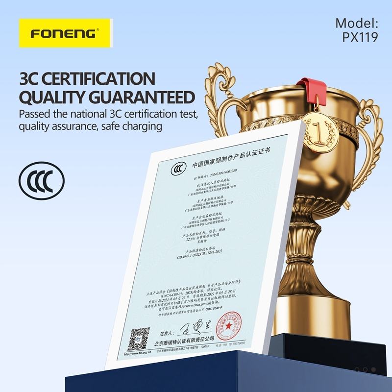 The FONENG PX119 10000mAh Magnetic Power Bank 22.5W is a versatile and convenient charging solution. With 3C certification and 22.5W fast charging capabilities, it ensures efficient and safe power delivery. The built-in mobile phone holder function, C-port fast charging cable, and support for dual-cable charging make it easy to use on-the-go, while the metal spray paint process and LCD digital display add a touch of style and functionality.