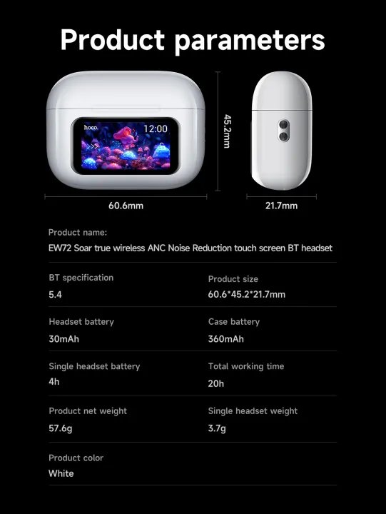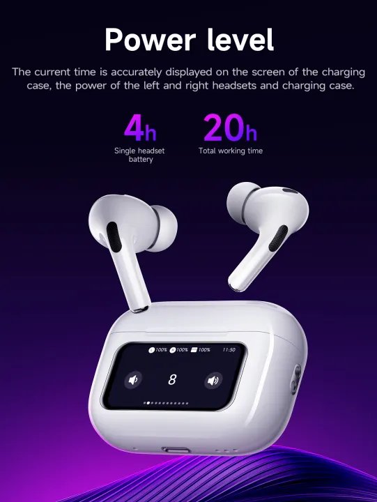 • Smart touch screen functions: language settings, screen wallpaper, headphone search, time settings, camera function (only supports iPhone), flashlight function, music control, volume adjustment, noise reduction transparency mode setting, sound mode setting, alarm clock setting , screen brightness adjustment.