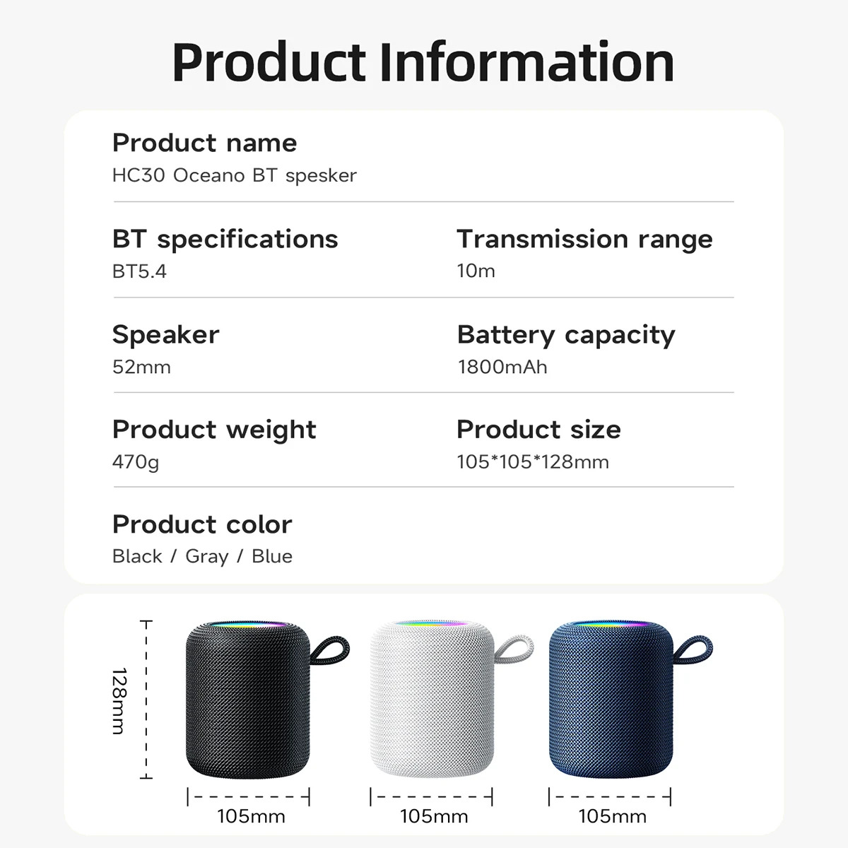 With True Wireless Stereo (TWS) pairing, enjoy true left-right channel stereo sound by connecting two HC30 units together. The built-in 1800mAh battery offers up to 5 hours of continuous play, and the modern design includes a loop strap for easy carrying.