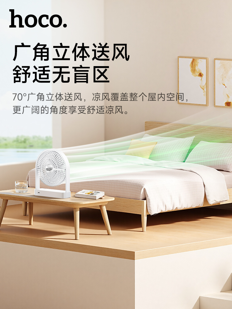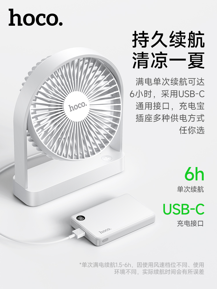 While designed primarily as a desktop fan, the Hoco HX65 is light and compact enough for portable use. Slip it into a bag and bring it to your office, hotel, or even a camping trip. Its quiet operation and cordless functionality mean you can use it virtually anywhere.