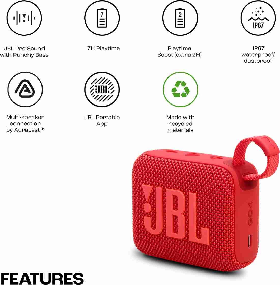 • One of the standout features of the JBL Go 4 is its impressive battery life, offering up to 7 hours of playtime on a single charge. And if you need even more time to jam out to your favorite tunes, simply activate the Playtime Boost feature to extend your battery life by an additional 2 hours. This ensures that you never have to worry about running out of battery power, even during long listening sessions.