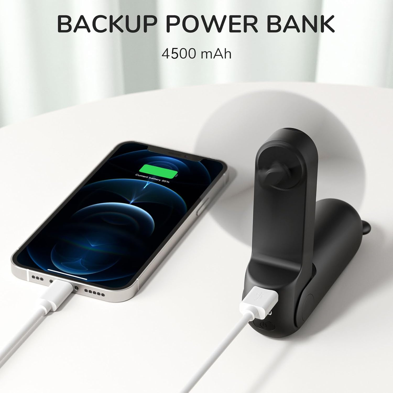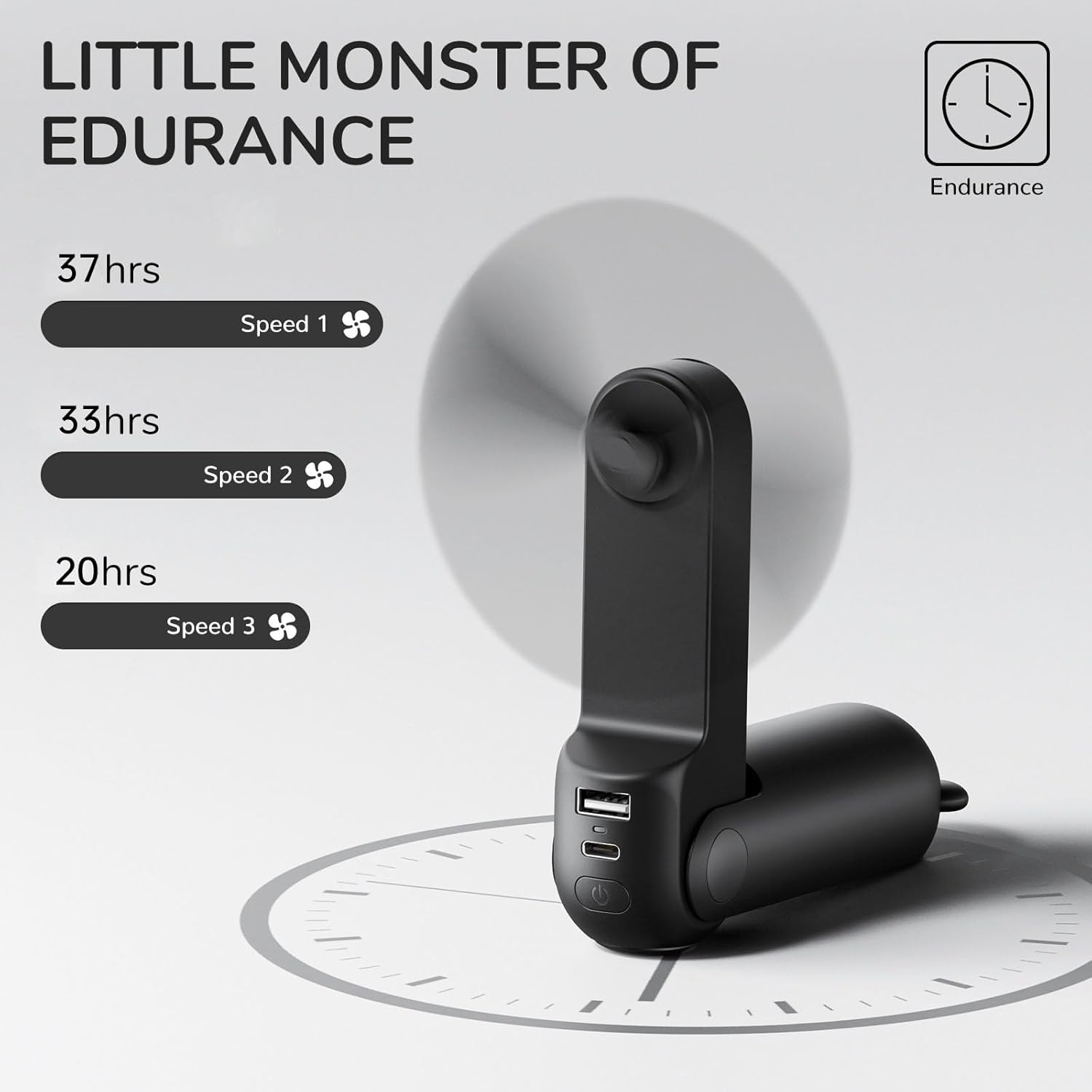 - Power Bank Function: A 5V/1A USB output port makes the mini fan a power bank (4500mAh) in an emergency, supplying power for mobile phones.