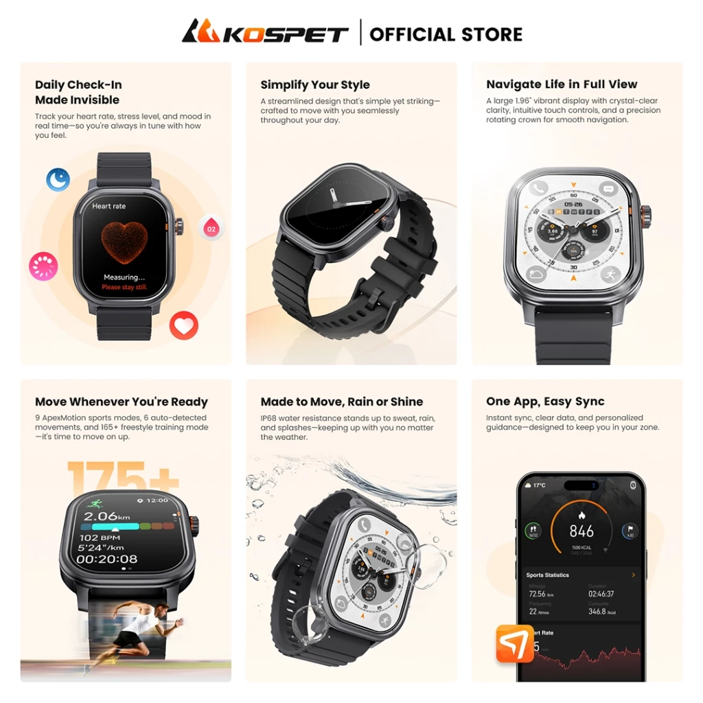 The KOSPET PULSE Smartwatch redefines what a wearable should be—stylish, intelligent, and highly functional. It empowers you to stay active, stay connected, and stay ahead in your daily routine. Whether you’re managing your health, staying in touch on the go, or personalizing your tech, the KOSPET PULSE Smartwatch delivers a comprehensive smartwatch experience with every glance at your wrist.