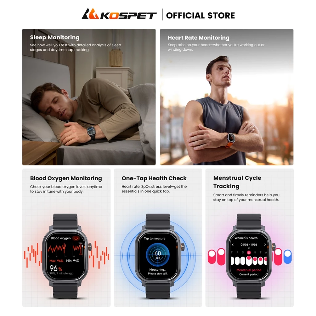 The KOSPET PULSE Smartwatch takes health monitoring to the next level. Equipped with advanced biometric sensors, it offers continuous tracking of: