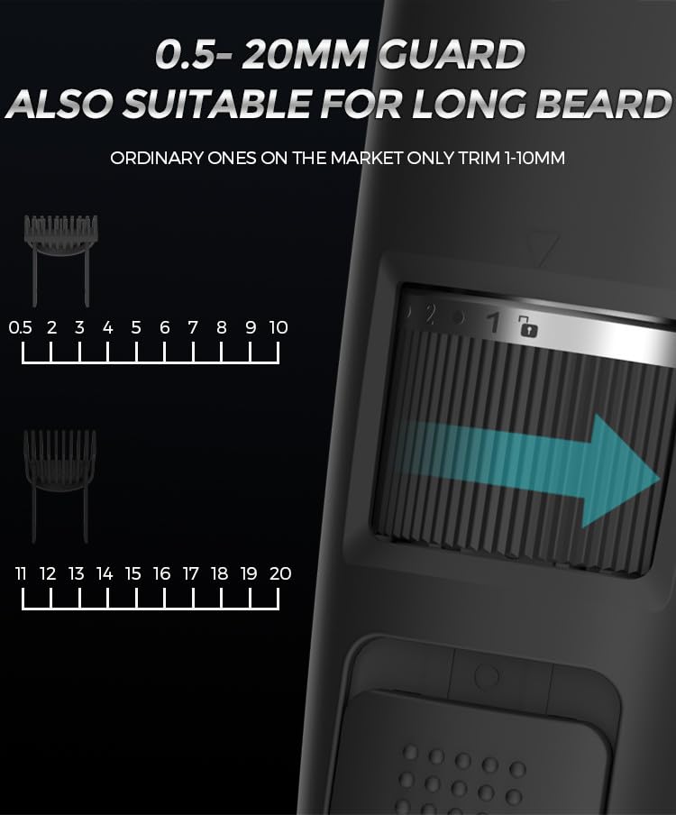 • Adjustable Length Settings: Tailor your beard style to perfection with multiple length settings. Whether you prefer a short stubble or a longer, well-groomed beard, the customizable options make it easy to achieve your desired look.