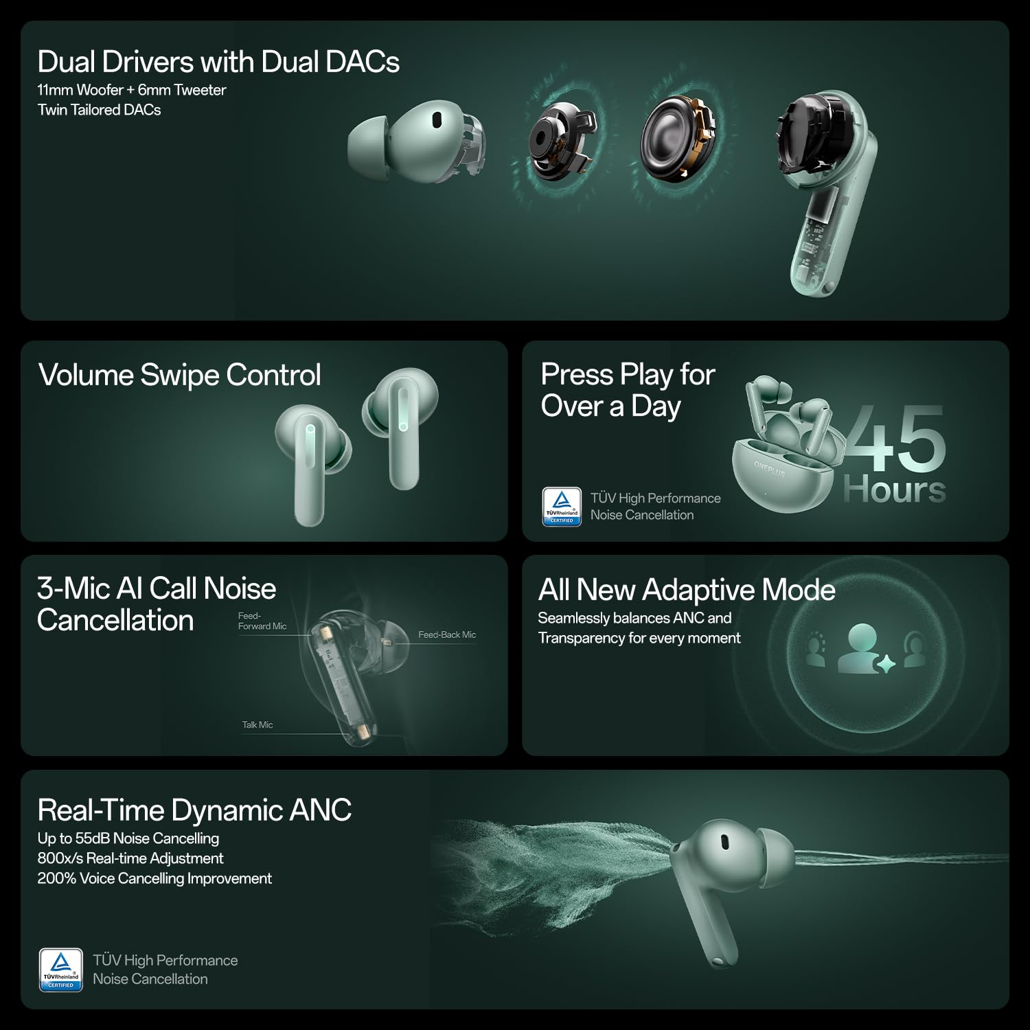 | Noise Cancellation | Type: Real-Time Adaptive ANC Depth: Up to 55dB Frequency Range: Up to 5,500Hz Modes: ANC On / Adaptive / Transparency / ANC Off Call Noise Cancellation: 3-Mic AI Call Noise Cancellation |