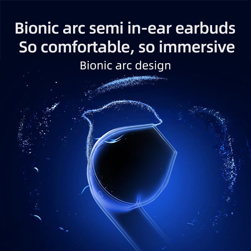 • Bionic arc: Long-time comfort, semi-ear earbuds. So comfortable, so immersive. Thanks to the bionic arc design, you won’t feel pain in your ears when wearing these earbuds. They can go deeper into your ear canals to boost the bass effect and make the sound richer than ever.