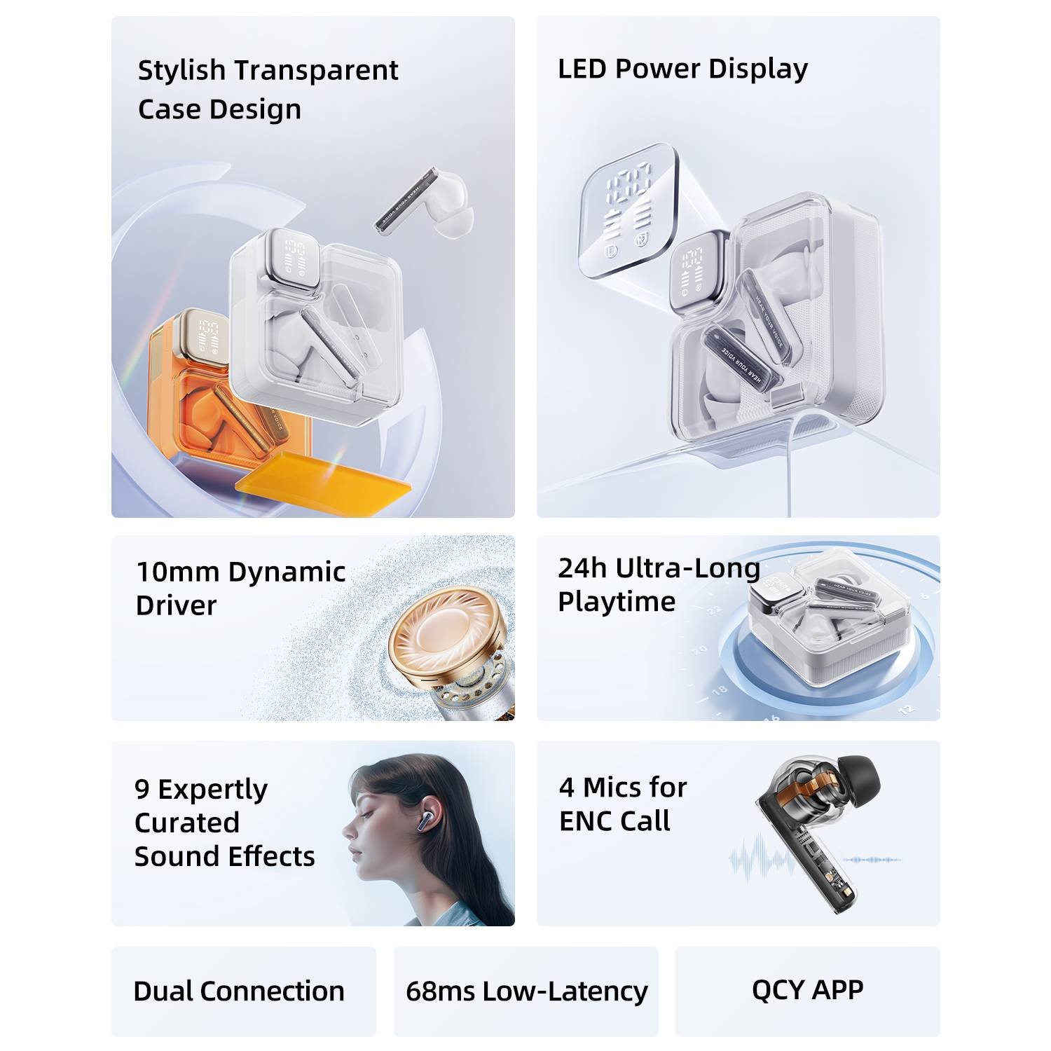 - Stylish Transparent Case Design:The sleek, fully transparent cyberpunk-style charging case and tech-inspired earbud stems design make QCY MeloBuds Neo a fashionable accessory that truly stands out;