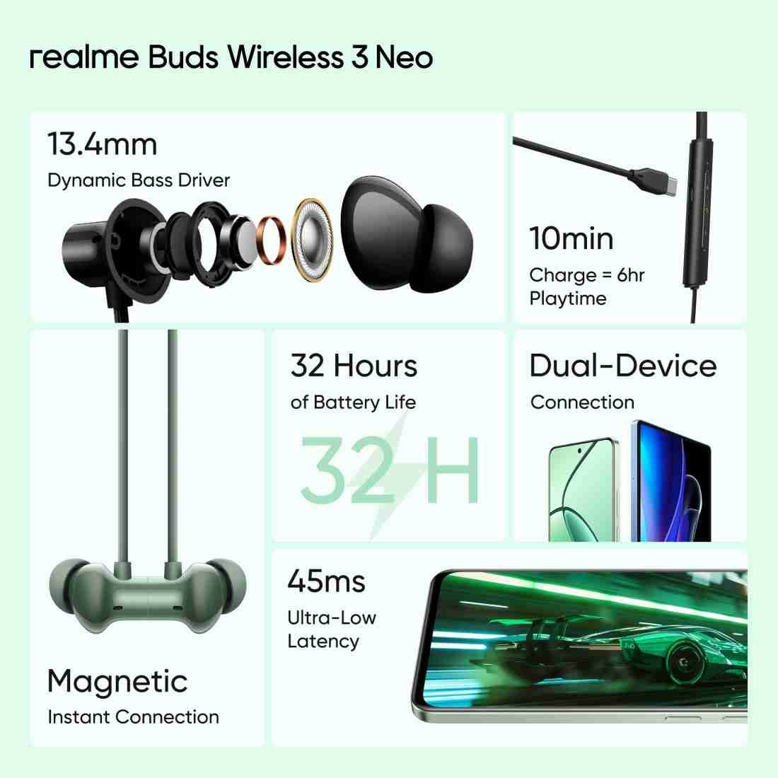 - Immersive Stereo Sound with Dynamic Bass Boost: Experience music like never before with the realme Buds Wireless 3 Neo Bluetooth neckband. Equipped with a 13.4 mm Dynamic Bass Boost Driver, these earphones deliver rich and immersive stereo sound with deep, powerful bass. Whether you’re listening to your favorite tracks or watching movies, enjoy a premium audio experience that brings your content to life.