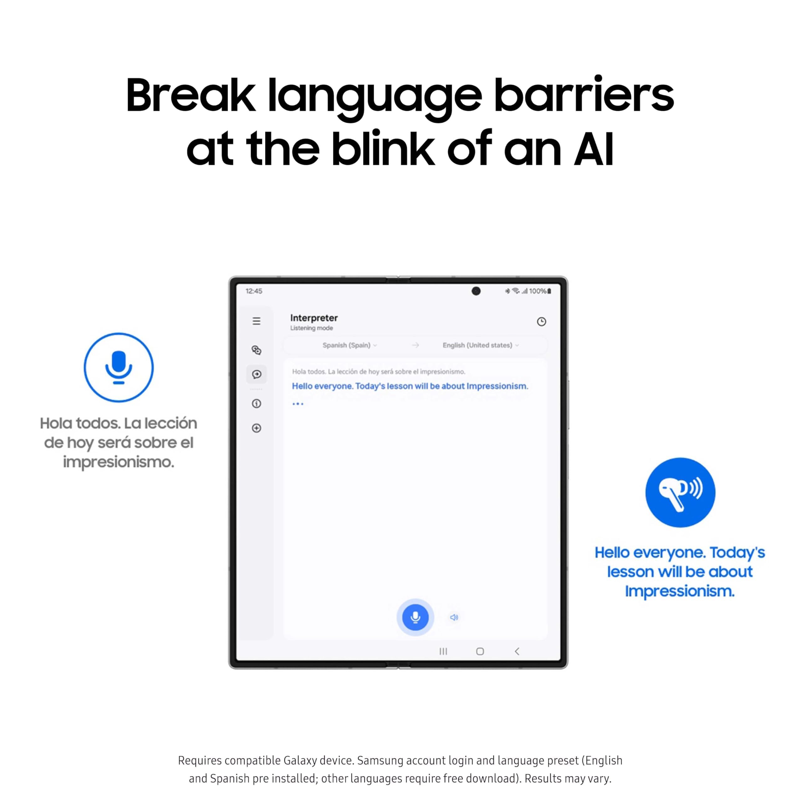 • They say “Hola,” you hear “Hello”: Hear translations through your Galaxy Buds during face-to-face conversations using Real-Time Interpreter with Galaxy AI³.