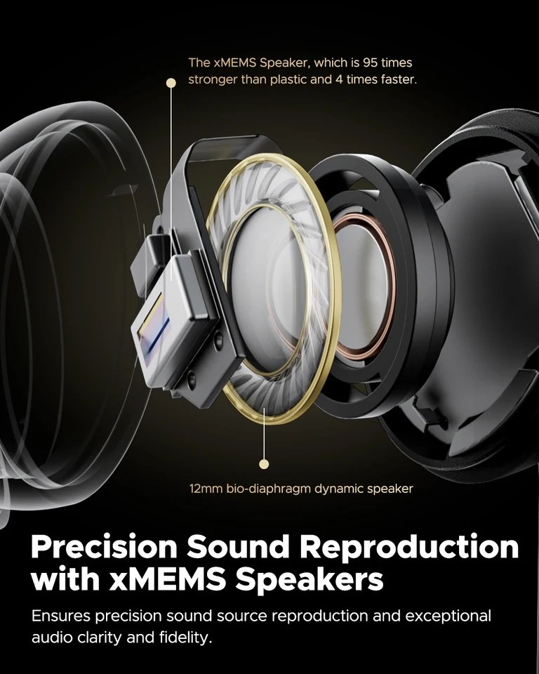 2. High sound quality: 12mm biofilm moving coil speaker, wide sound field, fine sound quality, ultra-wide frequency response range of 20Hz~40kHz, XMEMS speaker + power amplifier chip XAA-2000 Aptos Class-H