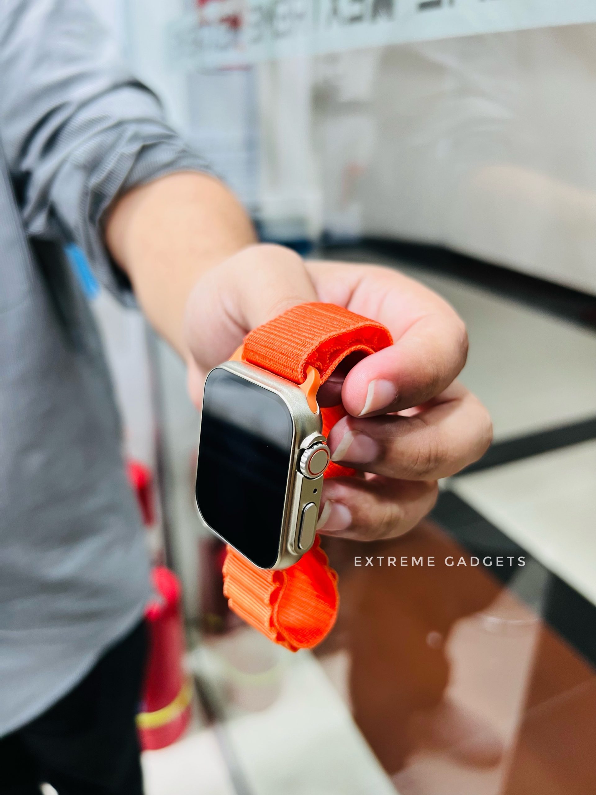 The Ultra is the first HW of the Apple Watch Ultra Design with a new orange button on the left side of its case. It’s called the “Action” button and it can be customized from settings to quick-start workouts, start a stopwatch, calls, and more.