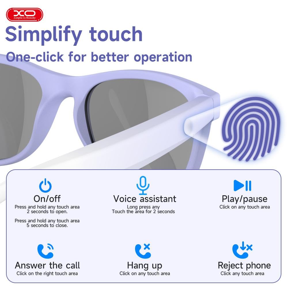 XO Smart Bluetooth glasses feature open-ear speakers that let you enjoy music while staying aware of your surroundings. Ideal for meetings, driving, gaming, and traveling.