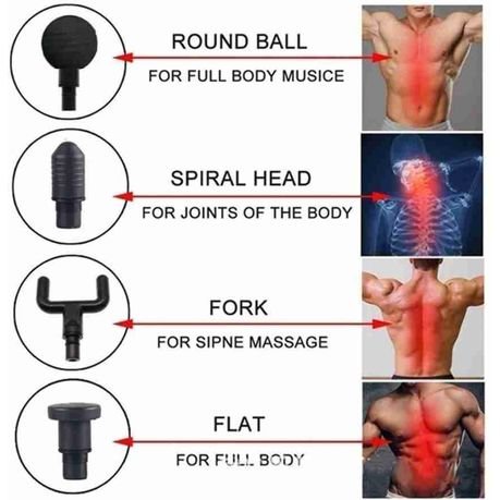 - In the box: Massage Gun, Y-Shape Head, Ball Head, Flat Head, Bullet Head, Type-C Cable, Manual.