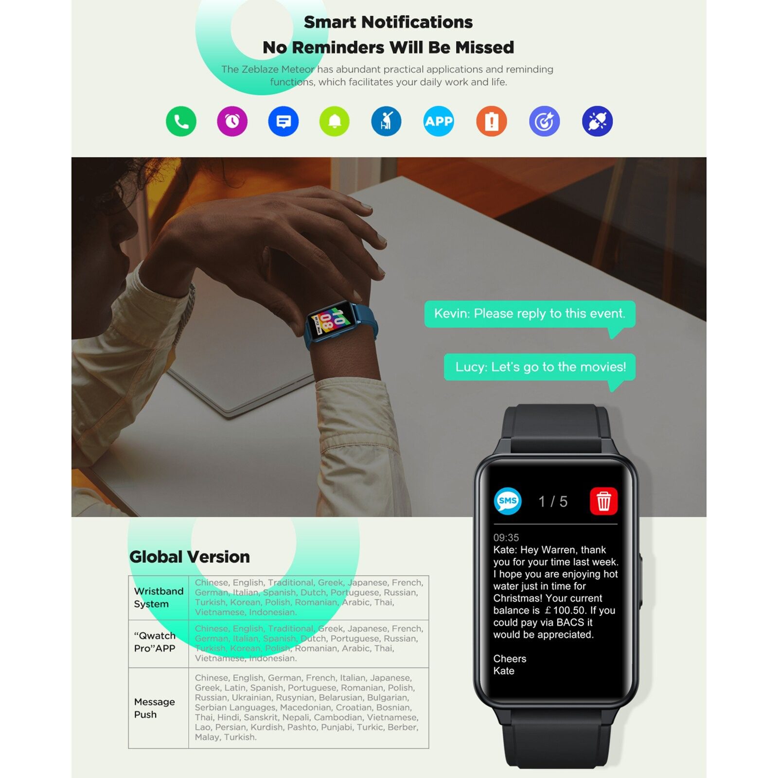 - Smart Reminder: After connected to the phone, it will provide synchronous display of message, call or social APP to remind you of important information.